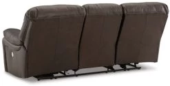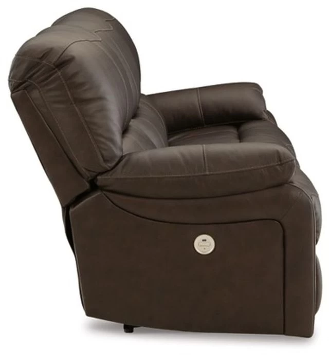 Leather throughout the seating area, inside back and armrests; faux leather covers remaining areas