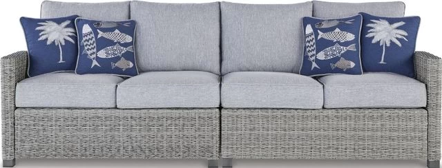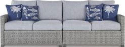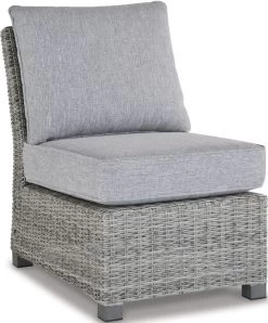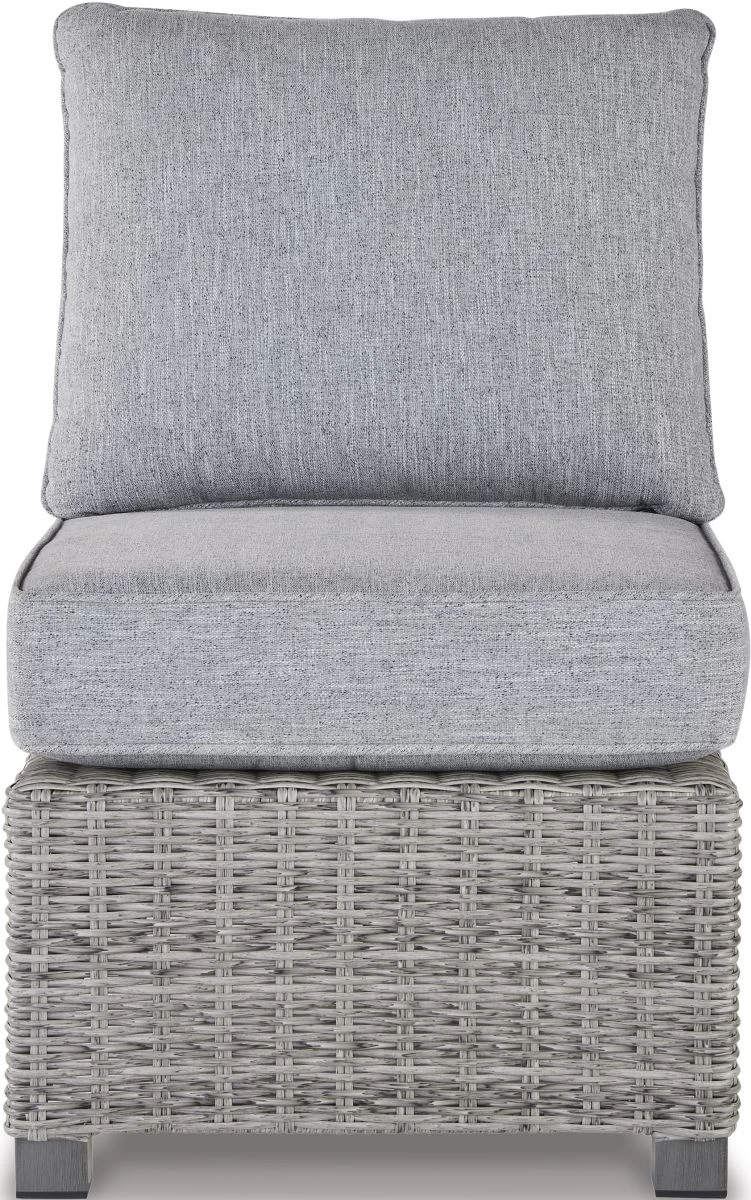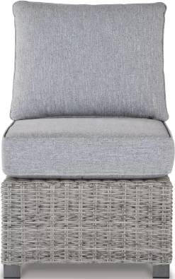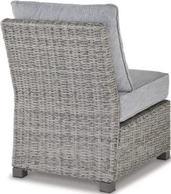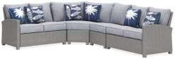 Includes outdoor armless chair with cushion, left-arm facing loveseat with cushion, right-arm facing loveseat with cushion and corner with cushion