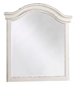 Traditional cottage design. Antiqued two-tone finish featuring chipped white cases with distressed wood finished tops. Tops feature Oak veneers, while the cases are made with Birch veneers and hardwood solids. Framed drawer fronts and overlay decorative corbels dress the cases nicely. Ornately shaped headboard with inset upholstered cushion and matching mirror frame. Dovetail drawer construction with ball bearing side glides. B743-93 night stand features an AC power supply with dual USB charging ports. B743-22 (3) drawer vanity, mirror, linen colored upholstered stool. Vanity mirror dimension: 28″W x 1″D x 26″H. Vanity stool dimension: 19″W x 14″D x 18″H. Elevating the art of traditional cottage styling, this dresser is your dream bedroom retreat realized. Antiqued two-tone aesthetic blends a chipped white with a distressed wood finished top for added charm. Framed drawer fronts and decorative corbels add refinement, while bail pulls in a dark bronze-tone finish lend a classic touch.