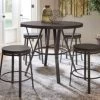 This clever counter height table and bar stool set invites you to raise the bar on small space living. An inspired choice for coastal chic or modern farmhouse settings, this clean-lined, simply striking set doubles the charm with brown tone plank effect tops, paired with grayish white bases with rub through effect for timeworn appeal. The table’s built-in open shelves make the most of every inch of space.