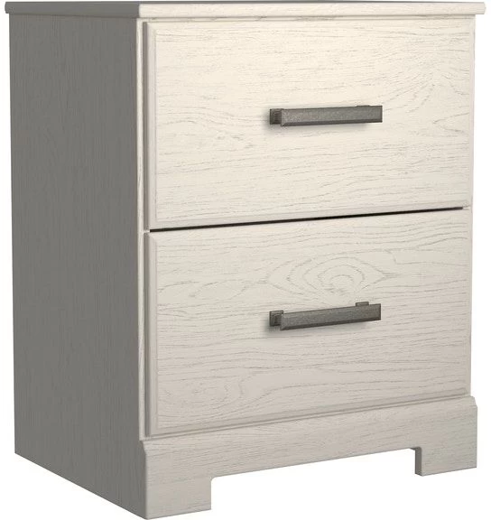 With its clean-lined look and modern attitude, this nightstand is a fresh style awakening. Crisp, white hue over subtle replicated wood grain easily complements other furniture finishes. Smooth drawer fronts with antiqued pewter-tone handles completes the aesthetic. Slim USB charger located on the back of the night stand tops