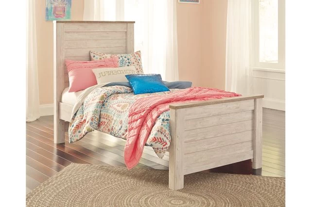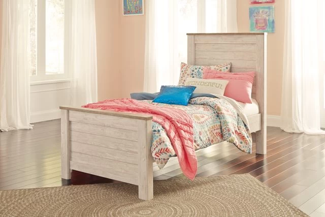 Make a charmingly rustic statement in your room with the plank-style detailing and replicated grain of the Willowton twin panel bed.