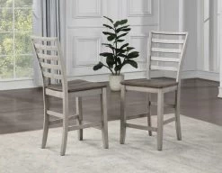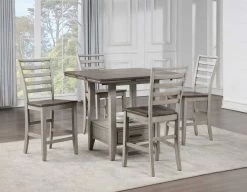 Casually styled and easy to live with, the Abacus dropleaf counter dining set features a great style with extra-special function. A smoky alabaster and smoky honey two-tone finish presents a fashion-forward footprint that is enhanced by the double drop-leaf table that converts from a 42-inch square to a 59-inch round table just by lifting the leaves. The built-in lazy susan top makes serving a breeze and you will love the comfort and look of the counter chair for the collection.