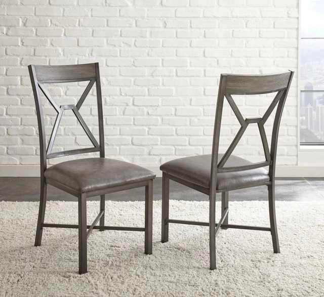 - Comfortable upholstered polyurethane chairs feature geometric metal pattern in back with wood rimmed chair top.
