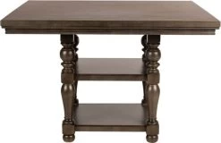 Transitionally styled counter dining table with elements of traditional and contemporary design to fit with virtually any decor. Turned legs on the pedestal counter table blend beautifully with the fashion-forward harbor grey finish to create a striking dining table. Pair with the counter chairs or counter bench from the Caswell collection or pick from other counter chairs in the line to fit your style. The counter table offers comfortable seating for up to eight people.