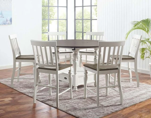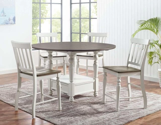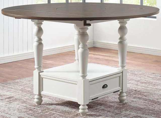 Gather ’round the counter height drop leaf table from the Joanna Collection. This 59 inch round table is packed with features the entire family will love starting with a double-drop leaf top that expands to seat up to eight. At the heart of the table-top is a lazy susan that makes serving dinner much easier! The turned leg counter base features a drop-down storage compartment for easy storage.