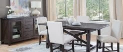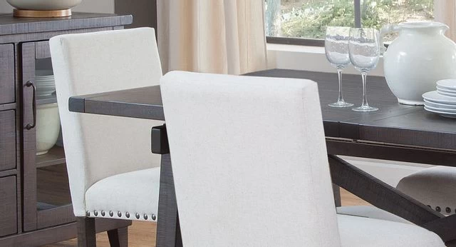 This beautiful raisin dining room chair is all you need to complete your dining room table from the Vivian’s collection. With upholstered seat and back, nailhead trim and constructed from rough sawn mahogany solids and veneers!